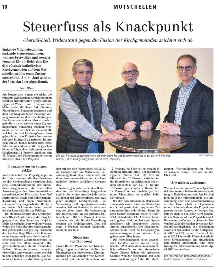 Als Projektteam beschäftigen uns intensiv mit der Frage, wie wir die Zukunft unserer Kirche am Mutschellen nachhaltig sichern können. Die drei römisch-katholischen Kirchgemeinden Berikon-Friedlisberg-Rudolfstetten-Bergdietikon, Eggenwil-Widen und Oberwil-Lieli stehen – wie viele kirchliche Organisationen – vor sinkenden Mitgliederzahlen, rückläufigen Einnahmen und steigenden Kosten. Gerade kleinere Strukturen geraten dadurch zunehmend unter Druck.