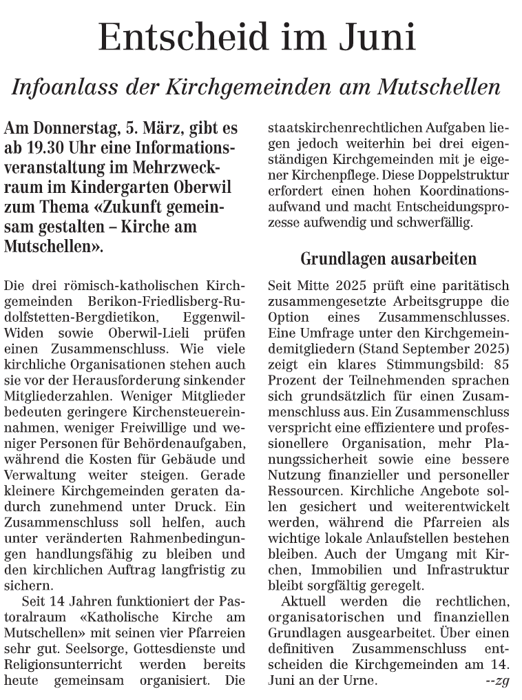 Seit 2012 bilden die Pfarreien Berikon-Friedlisberg, Eggenwil-Widen, Oberwil-Lieli und Rudolfstetten-Bergdietikon den Pastoralraum am Mutschellen. Auf…