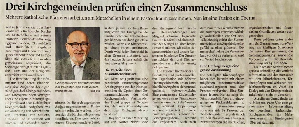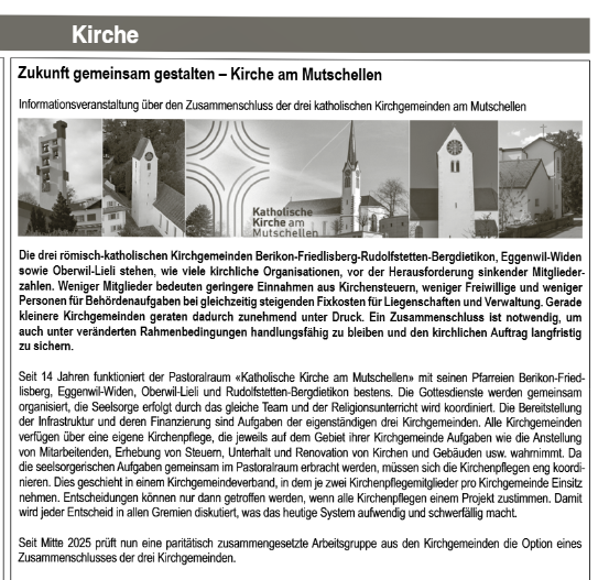 Als Projektteam beschäftigen uns intensiv mit der Frage, wie wir die Zukunft unserer Kirche am Mutschellen nachhaltig sichern können. Die drei römisch-katholischen Kirchgemeinden Berikon-Friedlisberg-Rudolfstetten-Bergdietikon, Eggenwil-Widen und Oberwil-Lieli stehen – wie viele kirchliche Organisationen – vor sinkenden Mitgliederzahlen, rückläufigen Einnahmen und steigenden Kosten. Gerade kleinere Strukturen geraten dadurch zunehmend unter Druck.